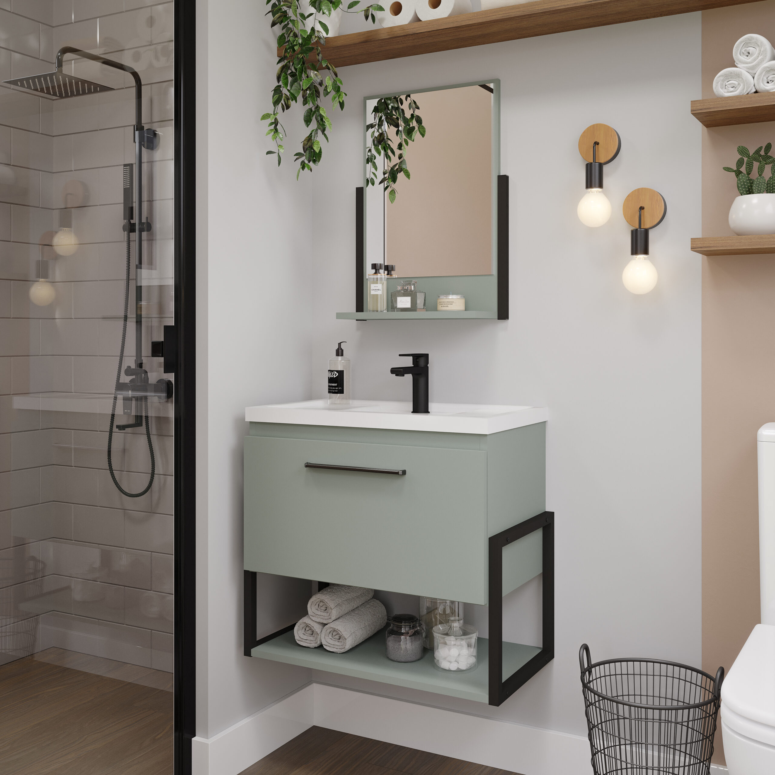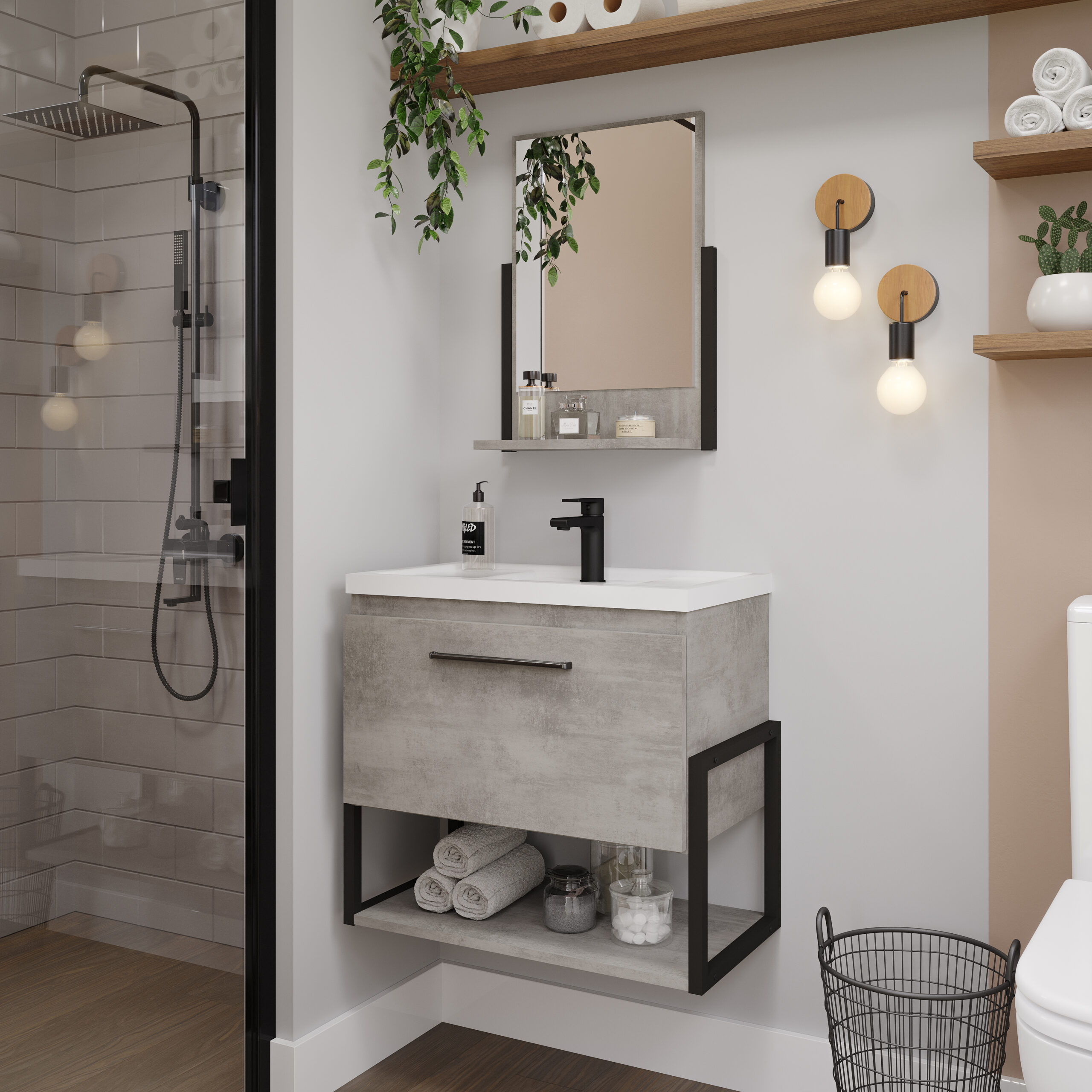 Com um visual moderno e marcante, o Kit Metalo traz a tendência do estilo industrial para dentro de casa. Ele é composto por armário 60cm e espelheira, ambos com detalhes em preto fosco que valorizam o ambiente com elegância e personalidade.